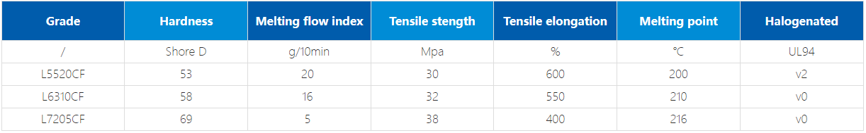 | Grade | Hardness | Melting flow index | Tensile stength | Tensile elongation | Melting point | Halogenated |
