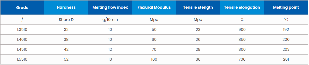 | Grade | Hardness | Melting flow index | Flexural Modulus | Tensile stength | Tensile elongation | Melting point |